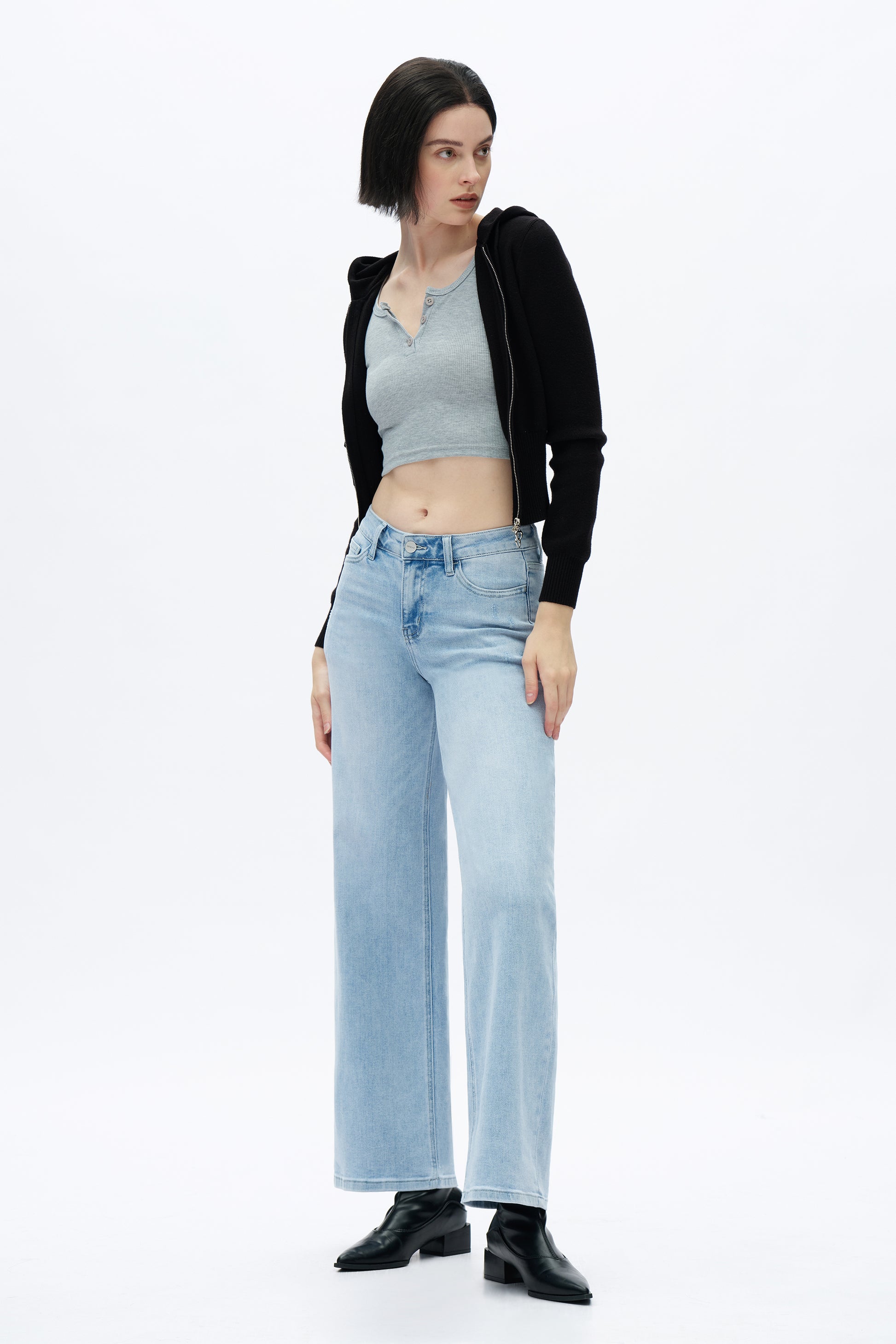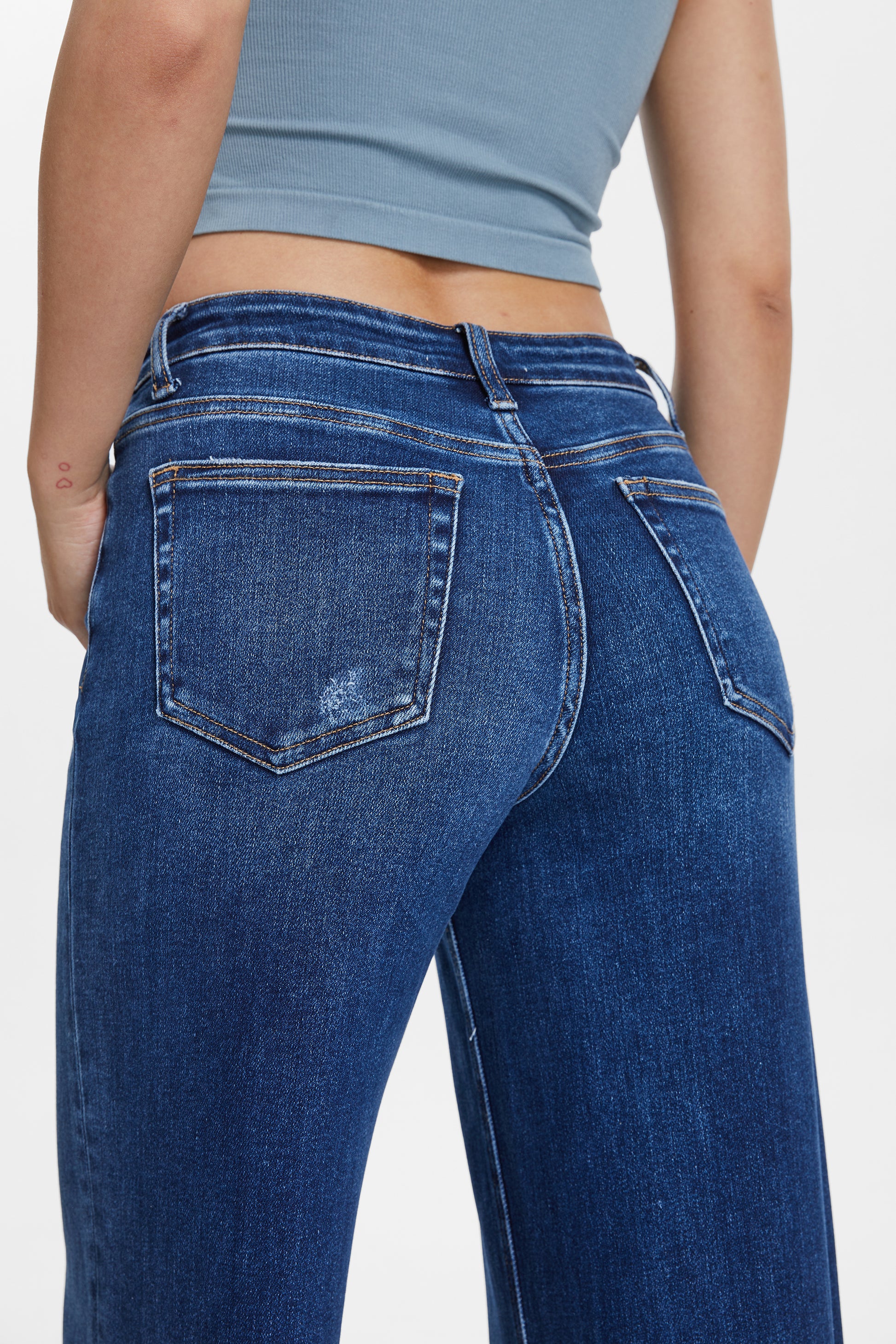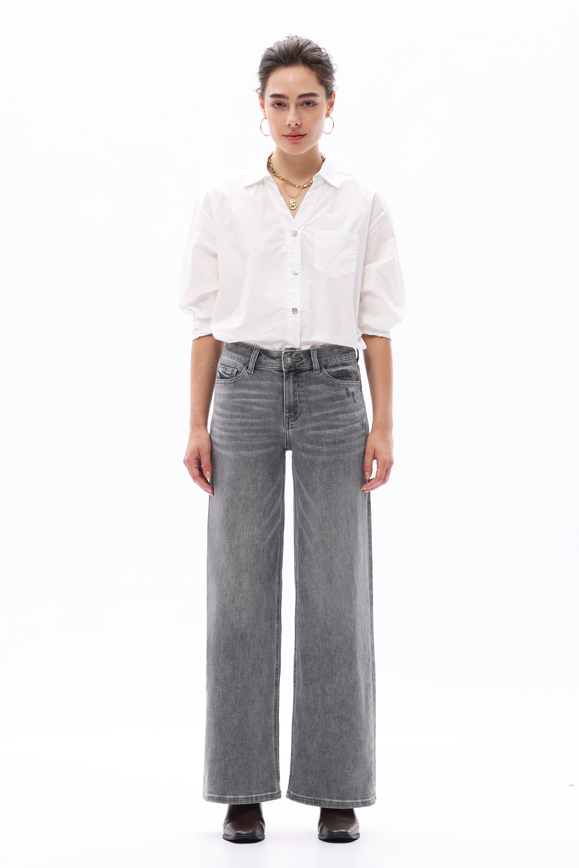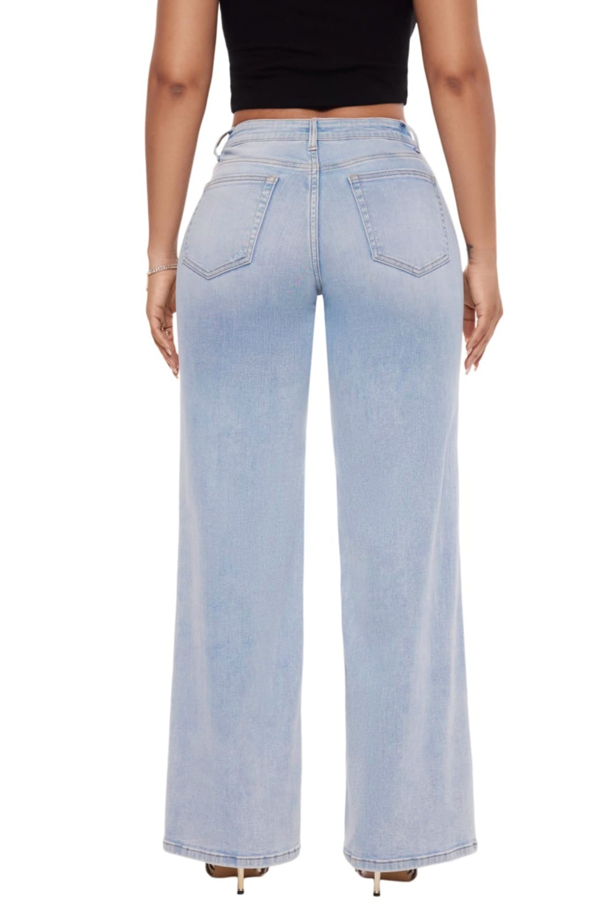 Elevate your everyday look with these Mid Rise Wide Leg Denim Jeans - a mid-rise fit meets flowy wide legs, featuring a specially designed BBL cut to enhance your curves and lift your backside, offering timeless comfort and versatile style for any outfit.