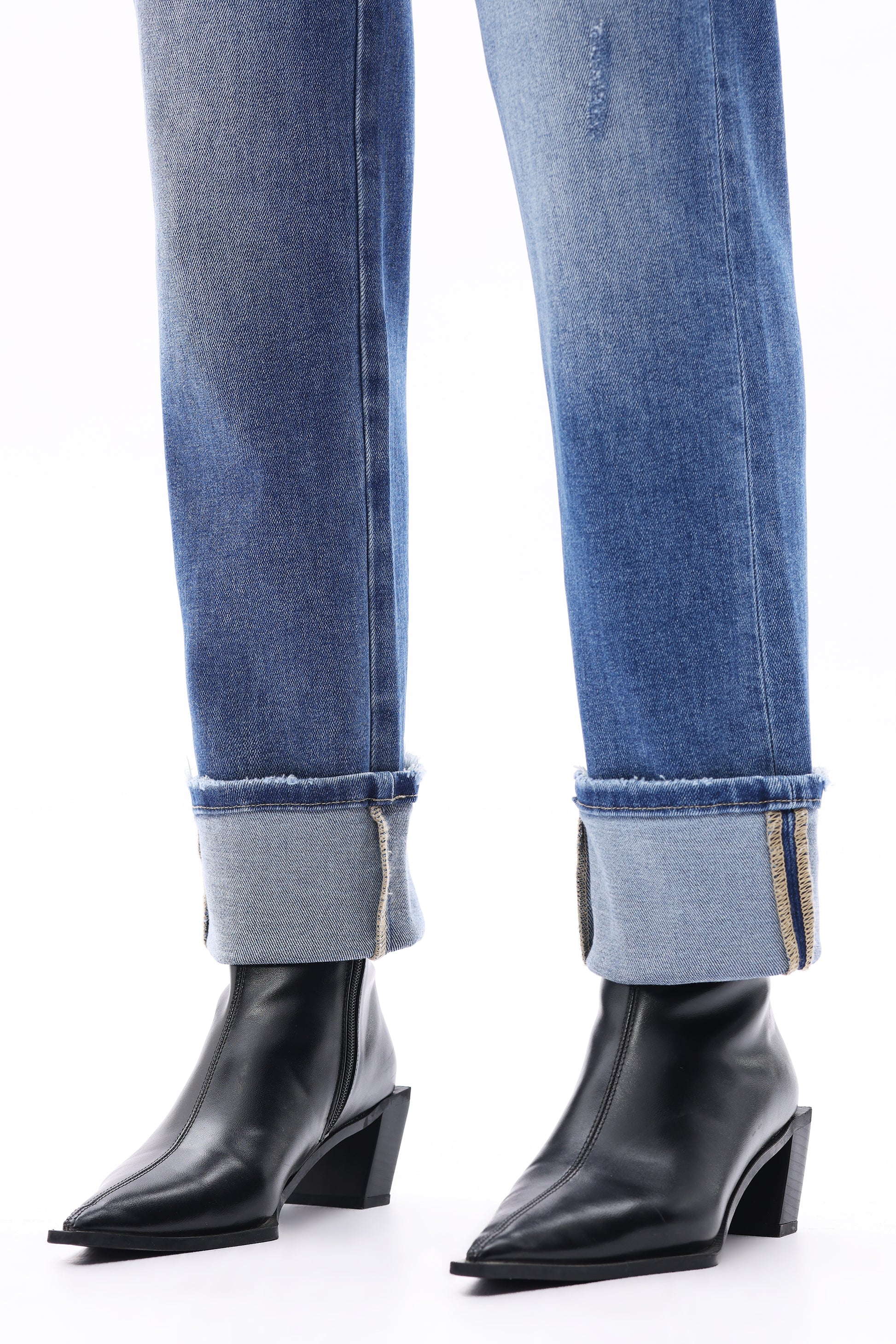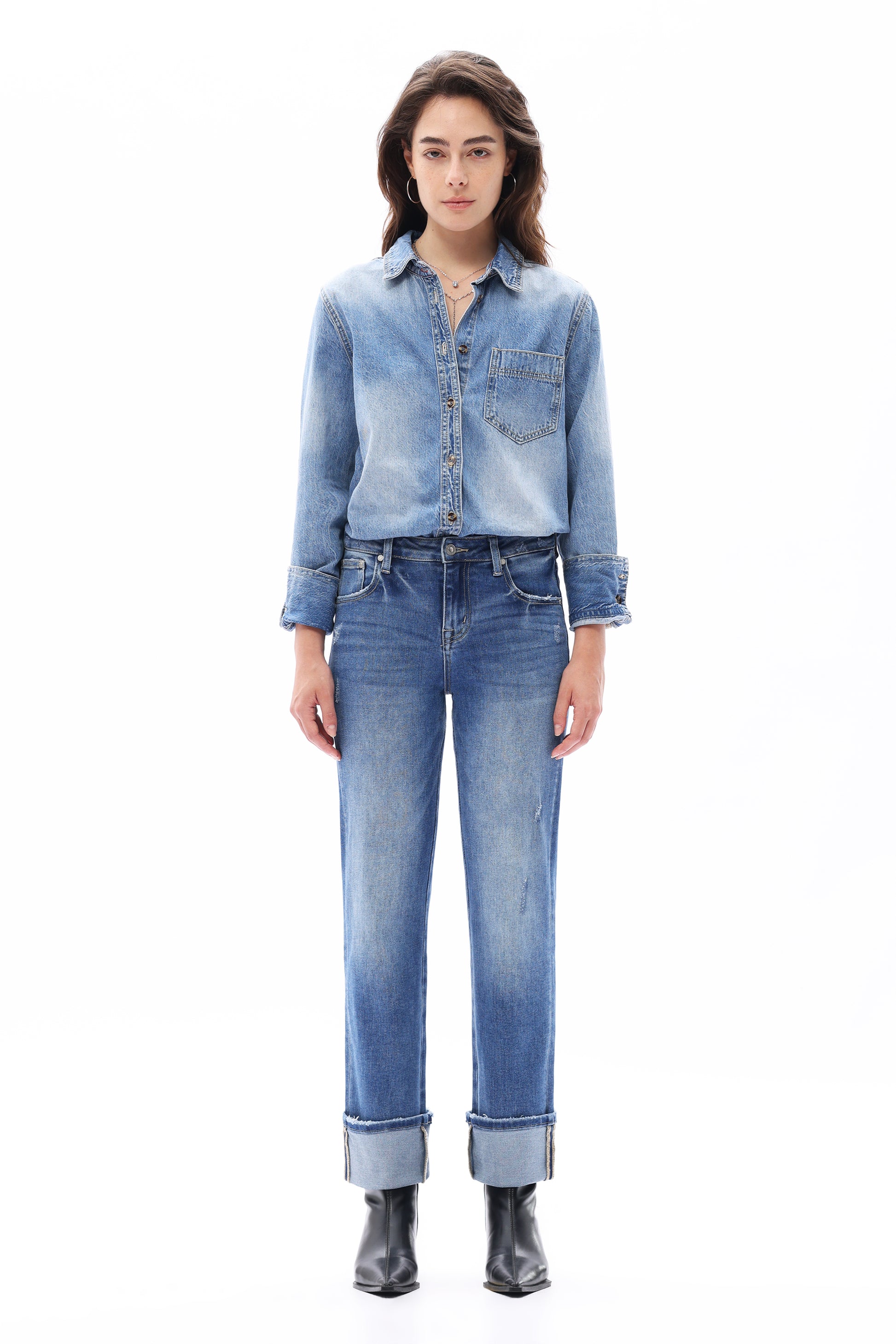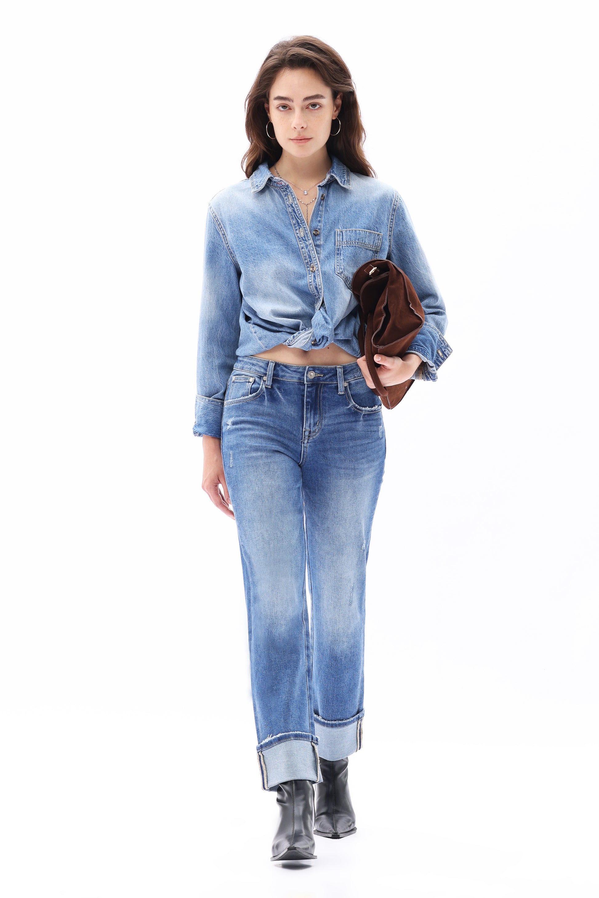 MID RISE CUFFED STRAIGHT DENIM JEANS OST5025 MDEIUM BLUE